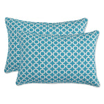 Update any outdoor area with this set of two on-trend geometric patterned outdoor lumbar pillows. For a modern effect, their off-white linking pattern pops from a background that's in a shade of teal. Fabric is durable and fade resistant. Additional features of these outdoor lumbar pillows include self welt cords for a clean finish and recycled polyester fiber fill with sewn seam closures. Also suitable for indoor use.
