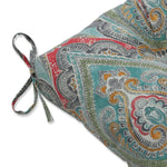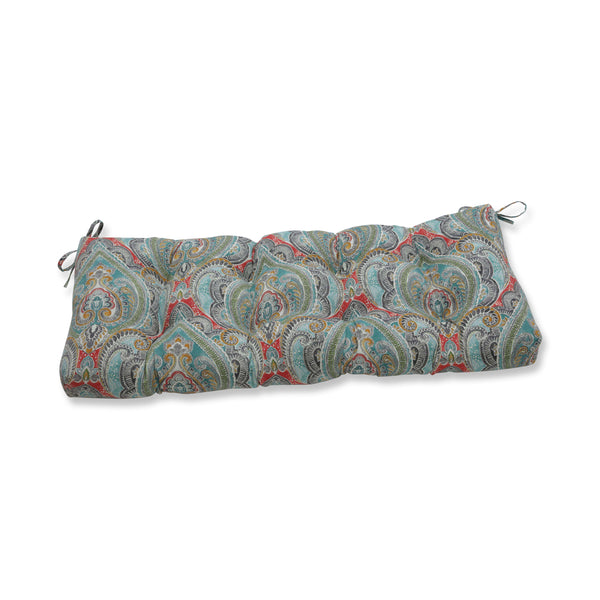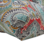 Make your patio the epitome of elegance with the paisley pattern of this outdoor bench cushion. Its intricate design is in lovely shades of coral, turquoise, green, yellow and gray, which emphasize every detail for a worldly look. Additional features of this outdoor bench cushion include tufted detailing, 14" ties and recycled polyester fiber fill with a sewn seam closure. Also suitable for indoor use.