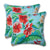 Bring beauty to your outdoor oasis with the tropical allure of this set of two outdoor throw pillows. Abundant tropical flowers and greenery are arranged with lush colors including rich shades of green, coral, pink and aqua set against a lovely soft blue ground. If you look closely amongst the flora, you will discover a small butterfly and hummingbird tending to their splendid garden. Made of 100% polyester. Additional features of these outdoor throw pillows include white contrasting welt cords for a beautiful finish and recycled polyester fiber fill with sewn seam closures. Also suitable for indoor use.