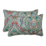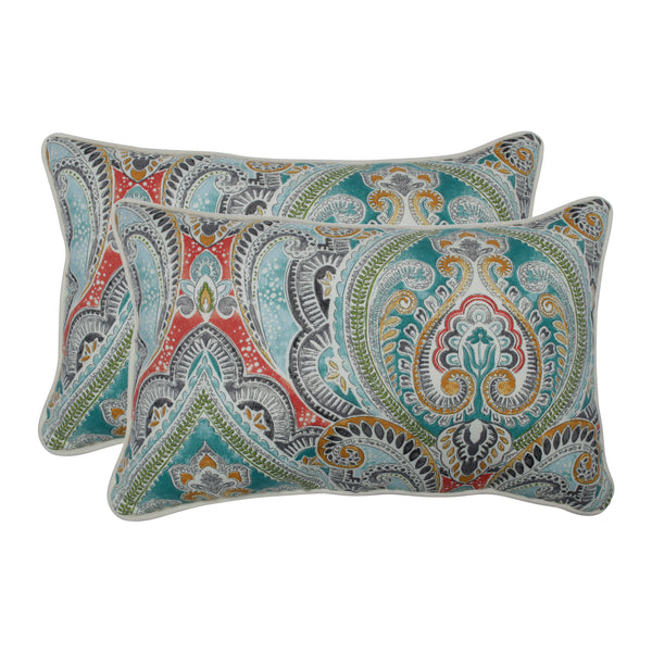 Make your patio the epitome of elegance with the paisley pattern of this set of two outdoor lumbar pillows. Their intricate design is in lovely shades of coral, turquoise, green, yellow and gray, which emphasize every detail for a worldly look. Additional features of these outdoor lumbar pillows include white contrasting welt cords for a clean finish and recycled polyester fiber fill with sewn seam closures. Also suitable for indoor use.