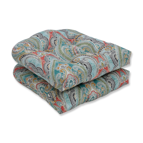 Make your patio the epitome of elegance with the paisley pattern of this set of two outdoor tufted wicker chair cushions. Their intricate design is in lovely shades of coral, turquoise, green, yellow and gray, which emphasize every detail for a worldly look. Additional features of these outdoor tufted wicker chair cushions include recycled polyester fiber fill and sewn seam closures. Also suitable for indoor use.