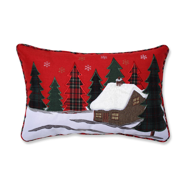 This decorative pillow combines the perfect blend of holiday charm and stylish sophistication for your seasonal decor. Embellished with appliqued plaid evergreens on a festive red ground, the embroidered scene exhibits a cozy herringbone cabin with snow capped roof set in a tranquil forest. Additional features of this lumbar pillow include a plaid welt cord and recycled polyester fiber fill with a sewn seam closure.