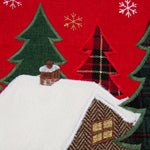Single-sided: Appliqued plaid evergreens and herringbone cabin with snow capped roof are set on a red ground with winter scene embroidery