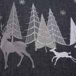 Single-sided: Design includes an embroidered winter scene in a mix of metallic yarns on a dark gray ground