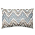 Add beauty and sophistication to your decor with the intricate chevron design of this rectangular throw pillow. Featuring stripes of pale sky blue, stormy gray, clean white and dark charcoal, each stripe has patterns of whorls, picot borders and dots to add plenty of gorgeous details to your rooms. Additional features include a knife edge seam for a clean finish and recycled polyester fiber fill with a sewn seam closure.