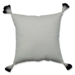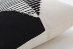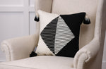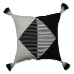 Make a modernistic impression with this abstract, decorative throw pillow. It is perfectly balanced with appliqued triangles and cording in alternating colors of off-white and black. In addition to the textured ground, frayed ends of the appliques create additional visual dimension. Completing the look, large dip dyed tassels are sewn in each corner. Additional features include a knife edge seam for a clean finish and recycled polyester fiber fill with a sewn seam closure.