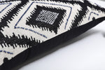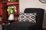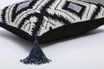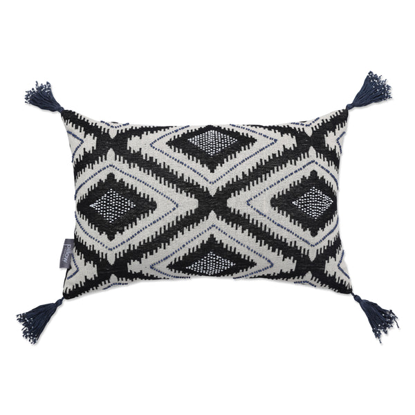 Inspired by global traditions, the geometric abstract pattern of this rectangular pillow is perfect for adding a modern touch to any room. Embellished with elaborate blue and pearlized beading, you?ll be captivated by the energetic dark blue pattern of bold diamond-like shapes on a natural ground. Blue corner tassels with pearlized beading complete the look. Flip the pillow over to a coordinating cotton back in a shade of navy blue. Additional features of this lumbar pillow include a knife edge seam for a clean finish and a recycled polyester fiber fill insert with a zipper closure.