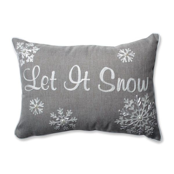 Bring on the snowy weather with the sharp design of this lumbar pillow in pale dove gray and creamy white. "Let It Snow" is in soft white chain stitch embroidery with snowflakes in crisp ribbons and gleaming faux pearls on a ground of gray. The reverse side features a printed pattern of falling snow, perfect the holidays and all winter long. Additional features include a coordinating white cord, recycled polyester fiber fill and a sewn seam closure.