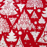 Design includes tree silhouettes printed in a metallic silver ink on a red ground