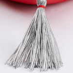 Knife-edge seam with a silver tassel on each corner; sewn seam closure
