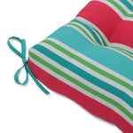 Bringing a classic resort look to your outdoor area, this awning stripe is the perfect combination of a traditional stripe in modern colors. Its bright coral and turquoise tones are mixed with a hint of green to create an inviting appeal. Additional features of this outdoor bench cushion include tufted detailing, 14" ties, recycled polyester fiber fill and a sewn seam closure. Suitable for indoor use.
