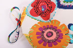 Let style bloom outside with the unique painterly flower pattern of this set of two outdoor tufted chair pads. Multicolored, stylized flowers in shades of blue, yellow, green and red are set against an off-white ground. Features include 14" ties and recycled polyester fiber fill with sewn seam closures. Suitable for indoor use in dining areas.