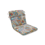 The elegance of this outdoor chair cushion in a lively paisley and floral design is perfect for accenting a patio. Its vivid shades of red, aqua, green, orange, yellow and indigo blue bring life to the scene through artful beauty. Additional features of this outdoor chair cushion include rounded corners, 14" ties and recycled polyester fill with a sewn seam closure.