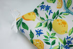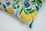 The lemon tree pattern of this set of two outdoor tufted chair cushions gives a warm and carefree vibe of summer. Bright yellow lemons with vivid green leaves pop off the crisp, white ground. Additional features of these outdoor tufted chair cushions include 14" ties and recycled polyester fiber fill with sewn seam closures. Also suitable for indoor use.