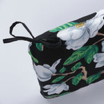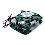 Captivating and sophisticated, this set of two floral outdoor seat cushions will modernize any outdoor or indoor living space. Bold white blooms are a striking contrast against the black ground. The pattern is printed on outdoor fade-resistant polyester fabric that has a slub texture for added dimension. Additional features of these outdoor seat cushions include round corners, 14-inch ties and recycled polyester fill with sewn seam closures. Also suitable for indoor use.