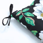 Captivating and sophisticated, this set of two floral outdoor tufted chair cushions will modernize any outdoor or indoor living space. Bold white blooms are a striking contrast against the black ground. The pattern is printed on outdoor fade-resistant polyester fabric that has a slub texture for added dimension. Additional features of these outdoor tufted chair cushions include 14-inch ties and recycled polyester fiber fill with sewn seam closures. Also suitable for indoor use.