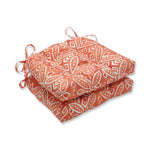 This globally inspired design provides a perfect welcome printed on this set of two outdoor tufted chair pads. Inspired from block printed designs, their repetitive pattern has petal-like shapes in off-white set against a ground in shades of orange, perfect for accenting a cosmopolitan outdoor living space. Made of 100% polyester. Additional features of these outdoor tufted chair pads include 14" ties to secure the cushions to your furniture and recycled polyester fiber fill with sewn seam closures. Also suitable for indoor use in kitchen and dining areas.