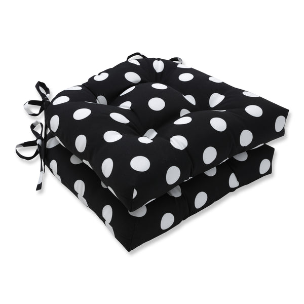 Riveting and timeless, the polka dot pattern of this set of two large outdoor tufted chair pads adds an exciting touch of elegance and playful energy to any outdoor area. In classic black and white polka dots, their fabric is fade resistant. Additional features of these large outdoor tufted chair pads include 14" ties to secure the cushions to your furniture and recycled polyester fiber fill with sewn seam closures. Also suitable for indoor use in kitchen and dining areas.