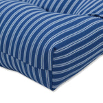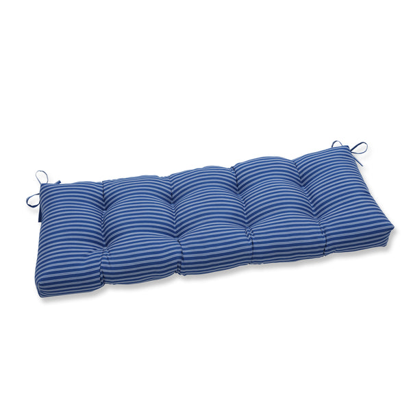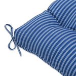 Relax in the classic style of this attractive and inviting updated blue and white ticking stripe. The sharp looking, on-trend pattern of this outdoor bench cushion shows a new wider stripe between the smaller ticking stripes. A perfect update to go with those farmhouse living spaces. Made of 100% polyester. Additional features of this outdoor bench cushion include tufted detailing, 14" ties and recycled polyester fiber fill with a sewn seam closure. Also suitable for indoor use.