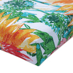 Bold bursts of sunflowers pop from this set of two outdoor oversized seat cushions creating a refreshing look for your outdoors. Substantial blooms and foliage in vivid shades of yellow, orange, green, blue and pink pop from the crisp white ground. A soft distressing adds artist-intended imperfections and character. Additional features of these outdoor oversized seat cushions include square corners, 14" ties and recycled polyester fill with zippered closures for easy removal. Also suitable for indoor use.