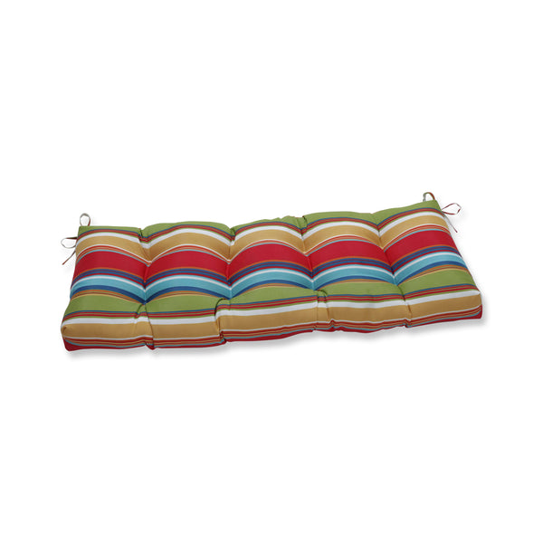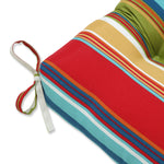 Give your patio a lively, festival-like style with the flattering awning stripes of this outdoor bench cushion. Ideal for brightening dark areas, its uneven striped pattern is in hot shades of red, yellow, green and blue. Made of 100% polyester fade-resistant fabric. Additional features of this outdoor bench cushion include tufted detailing, 14" ties and recycled polyester fiber fill with a sewn seam closure. Also suitable for indoor use.
