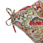 Bring elegant Jacobean style to your patio with this outdoor bench cushion. Its floral print pattern in shades of red, orange, green and dark gray is set on an off-white ground. Fabric is textured and fade resistant. Additional features of this outdoor bench cushion include tufted detailing, 14" ties and recycled polyester fiber fill with a sewn seam closure. Also suitable for indoor use.