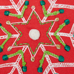 Single-sided: Snowflake design is in print and embroidery with appliqued mini pom poms trim set on a red ground