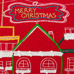 Single-sided: City scene design is in embroidery & applique with snow capped accents in mini pom pom trim on a red ground