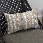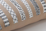 Get the look of a sampler with this striped rectangular throw pillow in tan and crisp off-white. Each appliqued vertical stripe features a different pattern embroidered in inky black thread, from dotted lines to chevrons and French knots, to give them an intricate, eye-catching look. Hand embroidered, each pillow is different and unique, just like the home it is going into. Additional features of this lumbar pillow include a knife edge seam for a clean finish and recycled polyester fiber fill with a sewn seam closure.