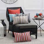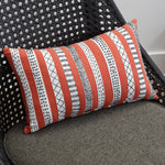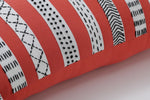 Get the look of a sampler with this striped rectangular throw pillow in warm coral orange and crisp off-white. Each appliqued vertical stripe features a different pattern embroidered in inky black thread, from dotted lines to chevrons and French knots, to give them an intricate, eye-catching look. Hand embroidered, each pillow is different and unique, just like the home it is going into. Additional features of this lumbar pillow include a knife edge seam for a clean finish and recycled polyester fiber fill with a sewn seam closure.